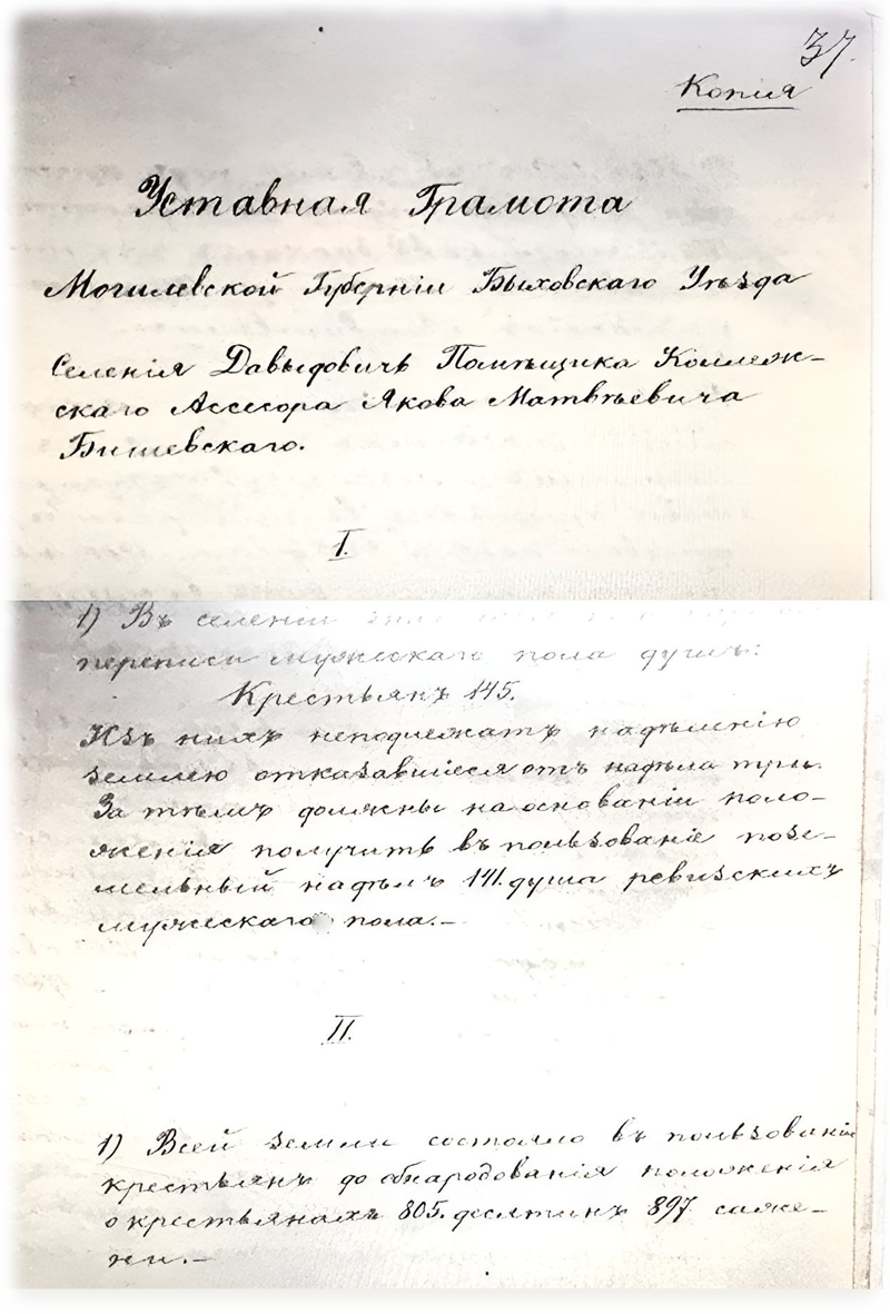 Уставная грамота Могилевской губернии Быховского уезда Селения Давыдович Помещика Колежского Ассесора Якова Матвеевича Бишевского.