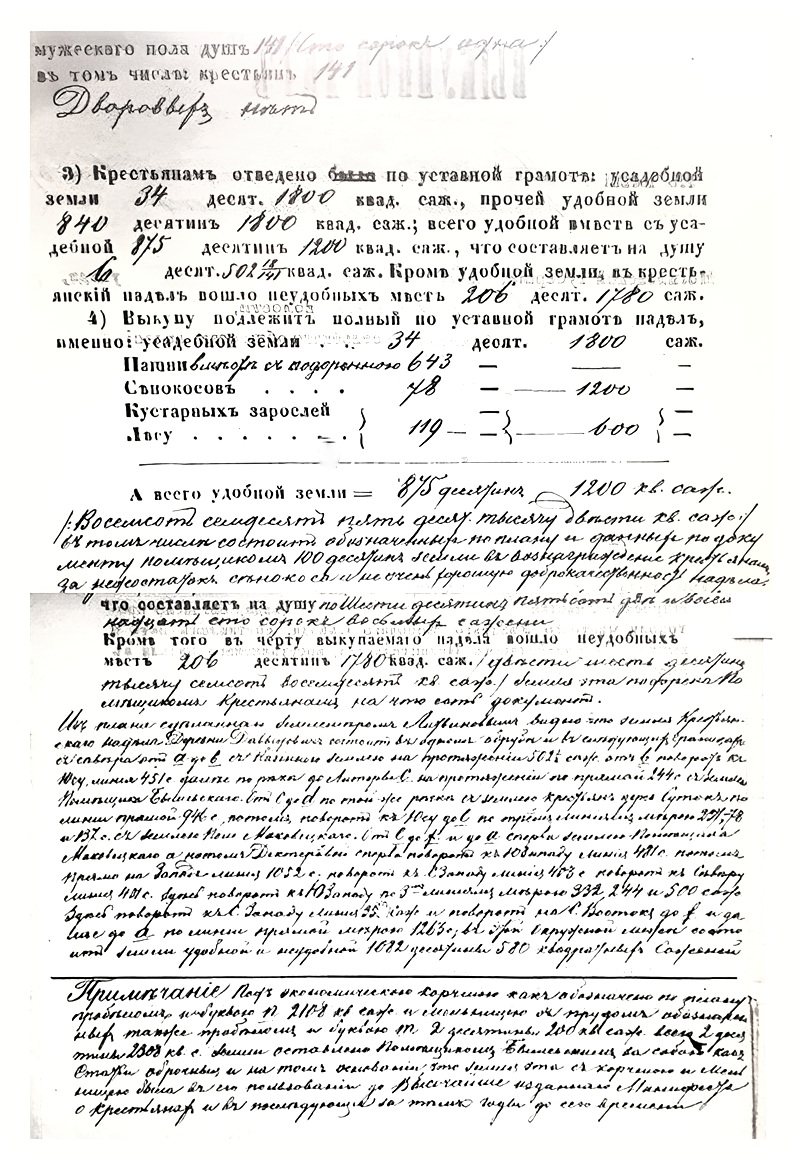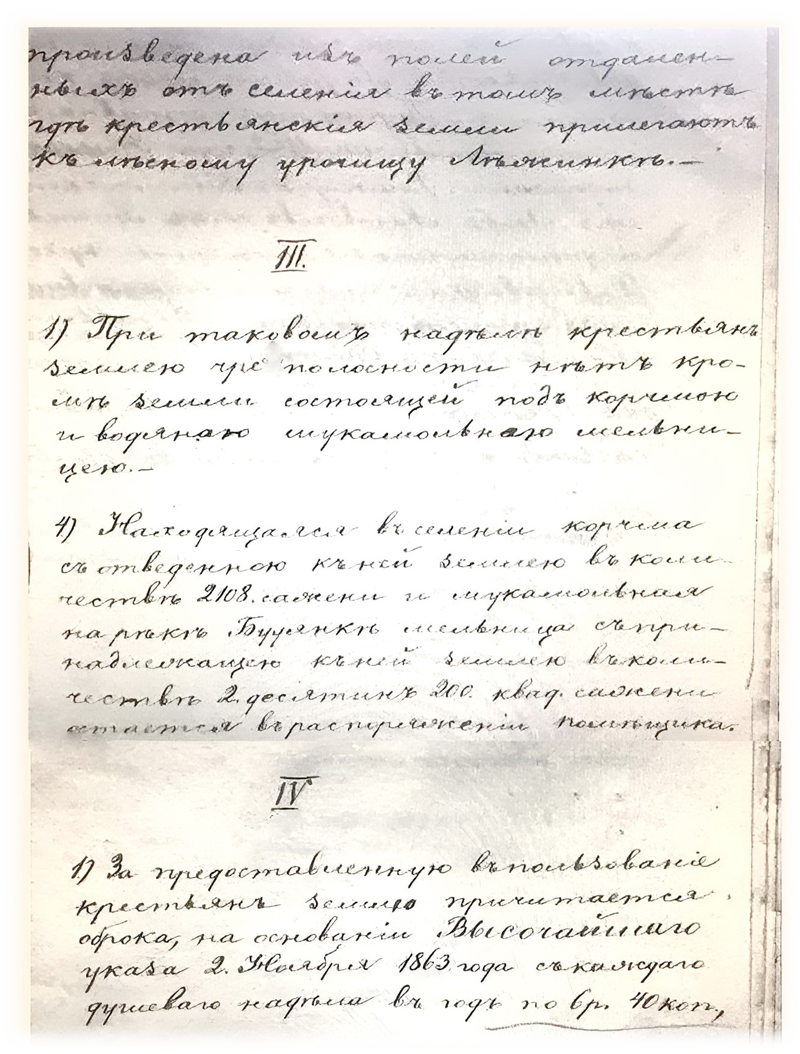 II 1) Всей земли состояло в пользовании крестьян до обнародования положения о крестьянах 805 десятин 897 сажень 2) Из них собственно под крестьянскою усадебною оседлостью 34 десятины 1800 саженей, как значит из плана составленного инженер штабс-капитаном Литвиновым. 3) Для местности где находится селение определен местным положением о поземельном устройстве крестьян высший размер душевого надела в 5 десятин 1200 квадратных сажени а по числу душ в селении высший размер надела на всё крестьянское общество составляет 775 десятин 1200 квадратных саженей. 4) Так как крестьяне пользуются ныне землею в большем противу высшего размера количестве то им предоставляется в постоянное пользование полное количество земли по расчету высшего надела 775 десятин 1200 квадратных саженей удобной и 206 десятин 1780 саженей неудобной, да сверх того подаренной помещиком удобной земли 100 десятин. За тем земля сверх сего количества бывшая в их пользовании отрезывается от их надела и обращается в распоряжение помещика, отрезка таковая произведена из полей отдаленных от селения в том месте где крестьянские земли прилегают к лесному урочищу Ляженке.
