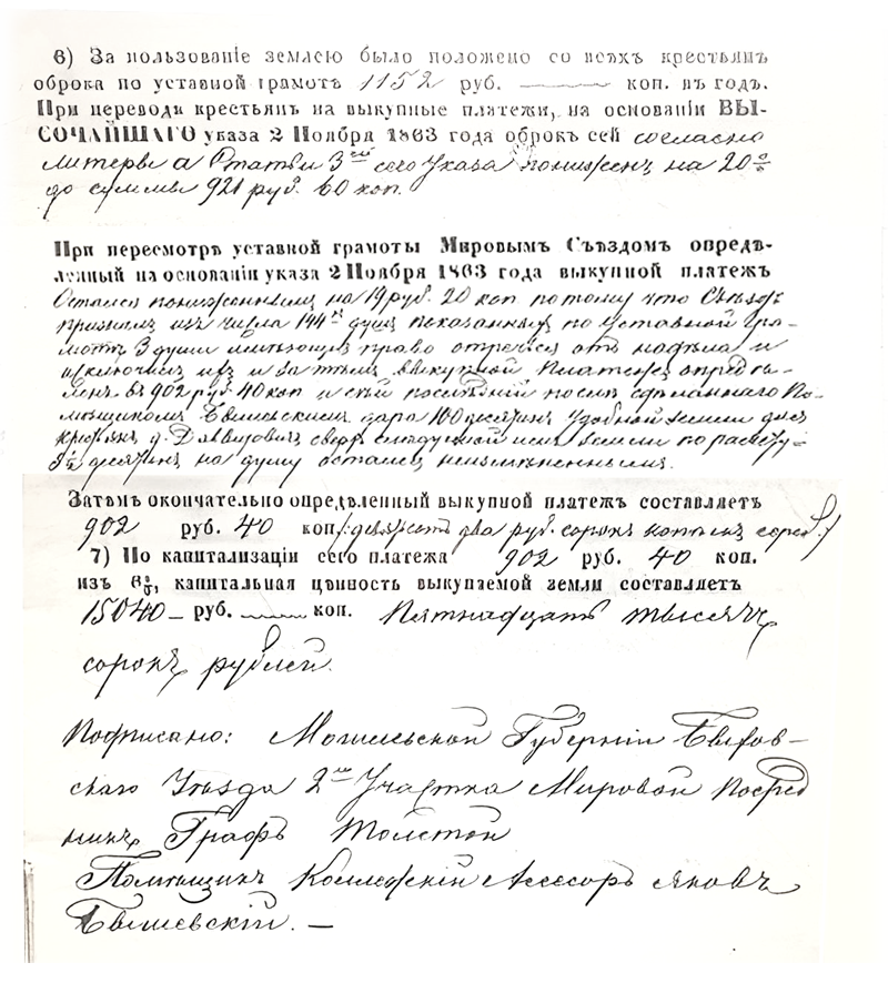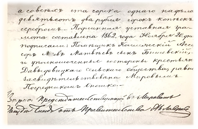 IV 1) За предоставленную в пользование крестьян землю причитается оброка, на основании Высочайшего указа 2 ноября 1863 года с каждого душевого надела в год по 6р 40коп. а со всех ста сорока одного наделов девятьсот два рубля сорок копеек серебром. Подлинная уставная грамота составлена 1862 года ноября 20 дня, подписали: помещик Колежский Ассесор Яков Матвеев сын Бишевский, и уполномоченные со стороны крестьян Давыдовицкого сельского общества, равно засвидетельствована Мировым Посредником Оношко.
