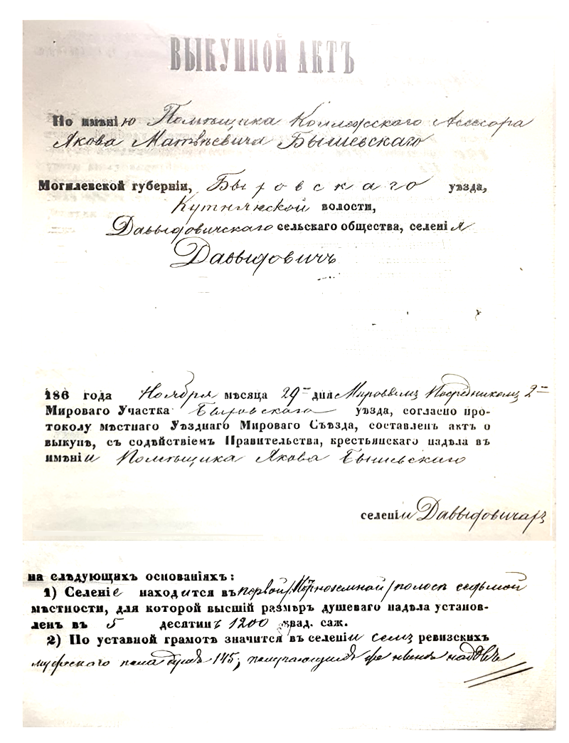 Размер предоставляемых крестьянам участков, как и перечень повинностей, которыми «временнообязанные» обременялись за пользование землей, записывали в упоминаемую в деле «уставную грамоту». Это был введенный реформой договор между помещиком и крестьянами, подлежавший контролю особых представителей властей – мировых посредников (чья должность, занимаемая исключительно выходцами из дворян, появилась тоже благодаря крестьянской реформе). Составлять уставную грамоту надлежало на каждое имение, причем такой договор заключался со всеми получателями надела сразу, волей-неволей объединенным в «сельское общество». Соответственно, «Давыдовичское» фигурирует в деле от лица крестьян, выстраивая свои дальнейшие отношения с землевладельцем, помещиком Яковом Матвеевичем Бышевским. Уставная грамота о наделении землею крестьян деревни Давыдовичи составлена в ноябре месяце 1862 года помещиком Колежским Ассесором Яковом Матвеевым Бишевским.