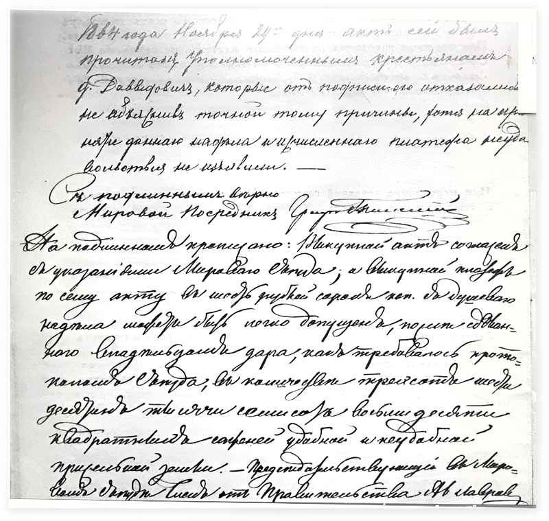 1864 года ноября 29 дня акт сей был прочитан уполномоченным крестьянам д. Давыдович, которые от подписей отказались, не объявив точной тому причины, хотя на продажи данного надела и причисленного платежа неудовольствия не проявили. С подлинным верно Мировой посредник Граф Толстой