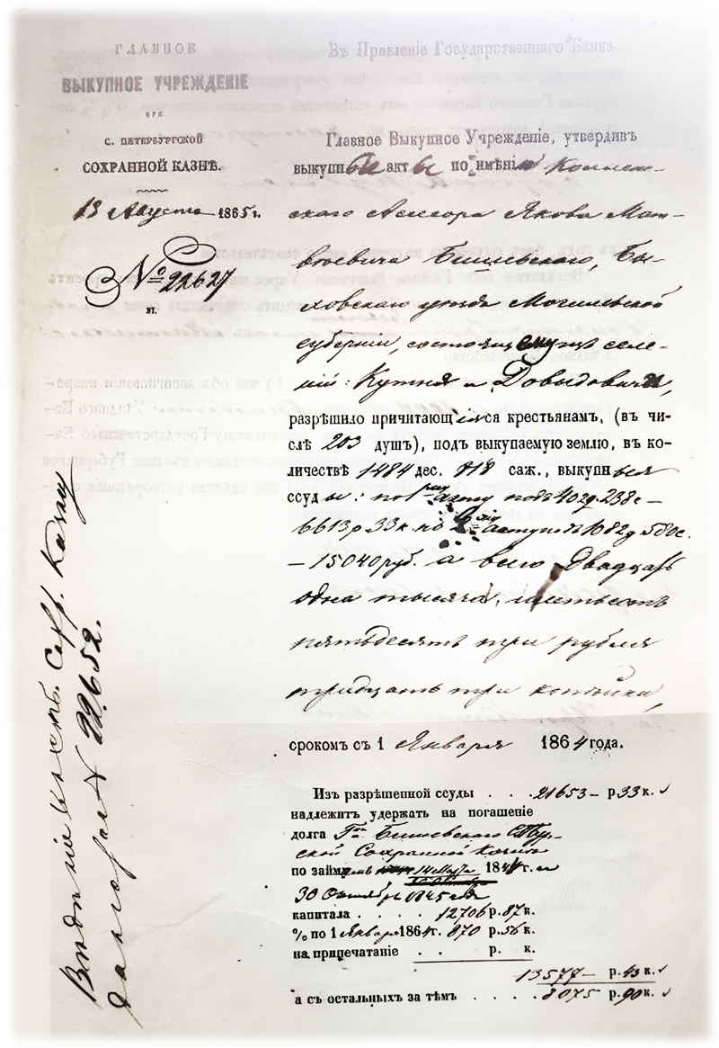 Дело о выкупе земельных наделов крестьянами села Кутня и деревни Давыдовичи Быховского уезда Могилевской губернии РГИА. 577 / 19 / 8 Дело о выкупе земельных наделов временнообязанными крестьянами Я.М. Бишевского селения Кунина Быховского уезда Могилевской губернии
