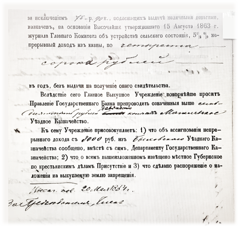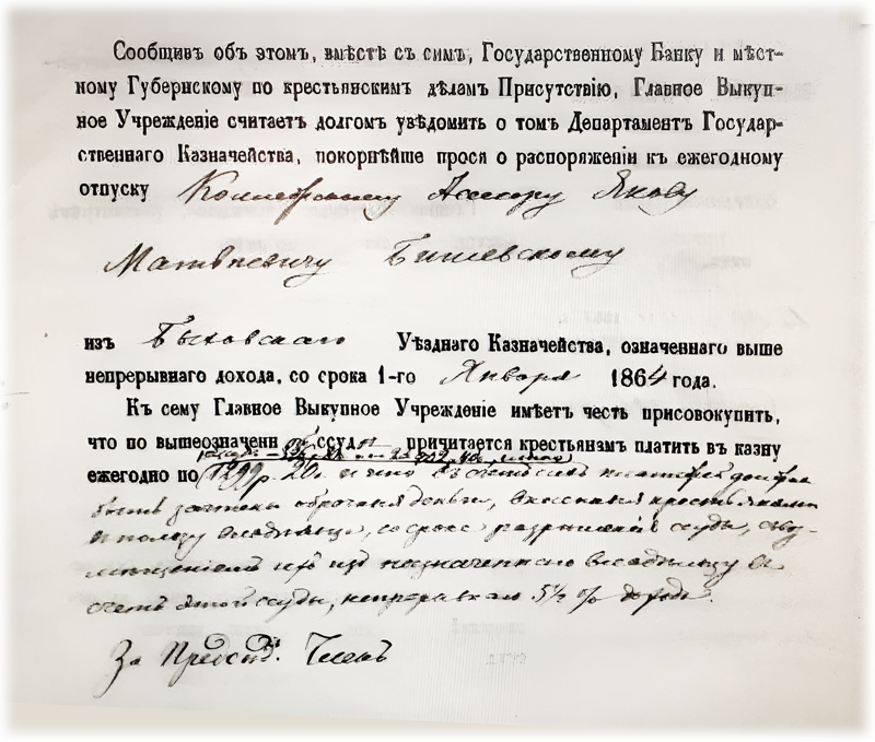 Выкупная ссуда в размере 15040 руб. предоставлялась банком сроком с 1 января 1864 года на 49 лет. До революции, получается, всё и выплатили. В действительности, итог получился поменьше. Правительство, напуганное размахом крестьянских выступлений в 1905 году (событий, известных ныне как первая русская революция), уже на следующий год отменило, наконец (начиная с 1907-го), выкупные платежи. Тем более, что по ним к тому времени накопилась изрядная недоимка.