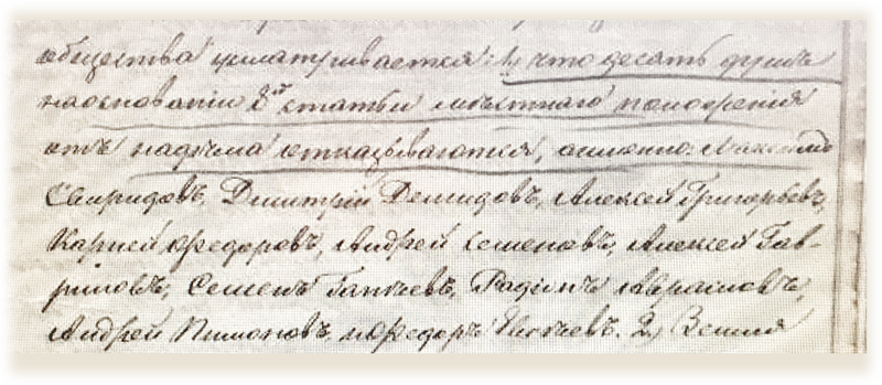 А ещё нанес на план и пронумеровал спорные (в разборках крестьян с Яковом Бишевским) территории: 1. Земля с Осовецкой границы; 2. Земля при корчме, мельнице и возле пруда; 3. Сутоцкий Лужок; 4. Урочище Ляженка; 5. Карёмки; 6. Урочище по речку Чёрную. Стоит обратить внимание на топонимы. Мы уже привыкли, что Каремка – это давыдовичская улица. А вот 160 лет тому назад Карёмки – это где-то там же, но за пределами деревни. Селище и Стайки – это где-то в районе сутоцкого луга. В статье Наши топонимы я предполагал, что у нас где-то были Стайки. Может кто-то всё же вспомнит, где эти Стайки находятся? С Ляженкой, вроде, всё понятно, если бы не вот это предложение: «Лес в Ляженцах крестьяне заростили сами…» Не обнаружив в «Описи приложениям к выкупным актам», копии «Мирского приговора», в котором должны фигурировать имена 141 получателя наделов, я не очень-то и расстроился. Из опыта прочтения выкупного дела крестьян А.И. Держанской-Дектеревой деревни Церковного Осовца я уже знал, что надежда увидеть в тех копиях фамилии своих предков очень призрачна. Увы, в те времена у крестьян, т.е. наших прадедов, и фамилий, похоже, не было – только имя и имя отца. В своих предположениях я не ошибся. Вот кусочек протокола Быховского Мирового Съезда, на котором разбирались претензии крестьян Давыдовичского сельского общества.