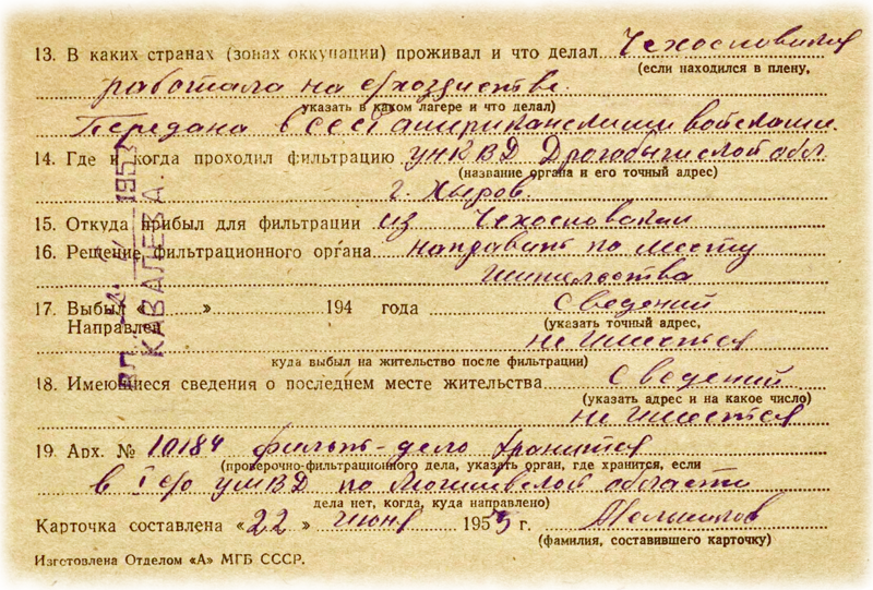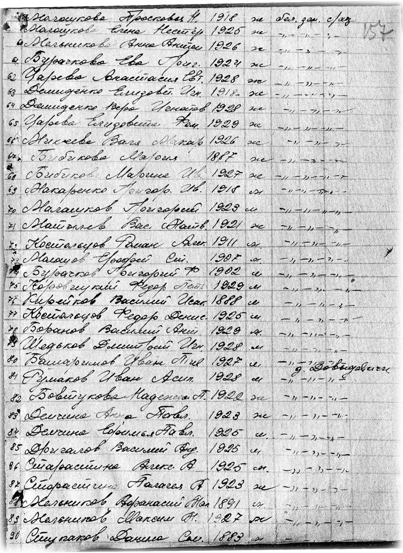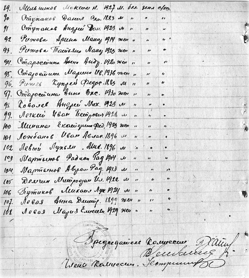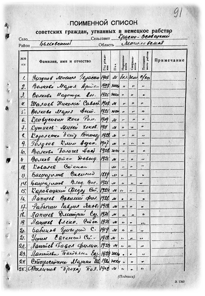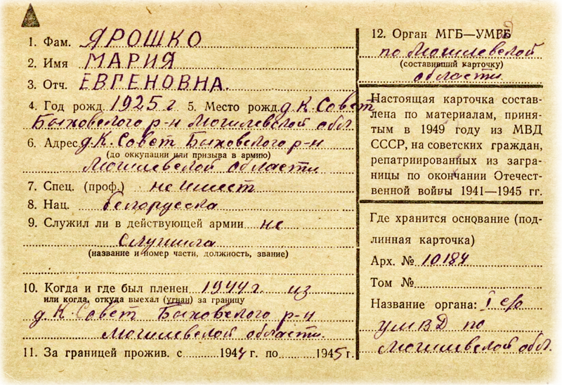 При виде этих актов я сразу вспомнил мамин рассказ, как она в 1944-м ходила по оставшимся целыми домам и землянкам Давыдович и составляла, похоже, вот эти акты. Папа был ещё на фронте. Жили бедно, голодно. У всех от щавеля и крапивы черные зубы. А в одном доме на столе целая стопка блинов, только что из печи. Тот запах мама помнила всю жизнь. Чуть не упала в обморок. Тот дом был Ступакова Василя Михайловича, который потом стал нашим соседом - вернувшись с фронта папа поставил новый дом рядом с его. Василь Михайлович был ранен в 1942 году в ногу. В 1943 году после выписки с госпиталя вернулся в освобожденную Беларусь. У нас ещё стояли немцы и он жил где-то на мстиславщине. Домой с мстиславщины он вернулся не с пустыми руками. Будучи хорошим столяром, смог заработать, в том числе и несколько мешков муки. Акты ущерба можно посмотреть в Государственном архиве Могилевской области: фонд 306 опись 1 дело 72. А вот этим документом я уже сам в том же архиве разжился. Это родная сестра мамы с Красного Осовца.