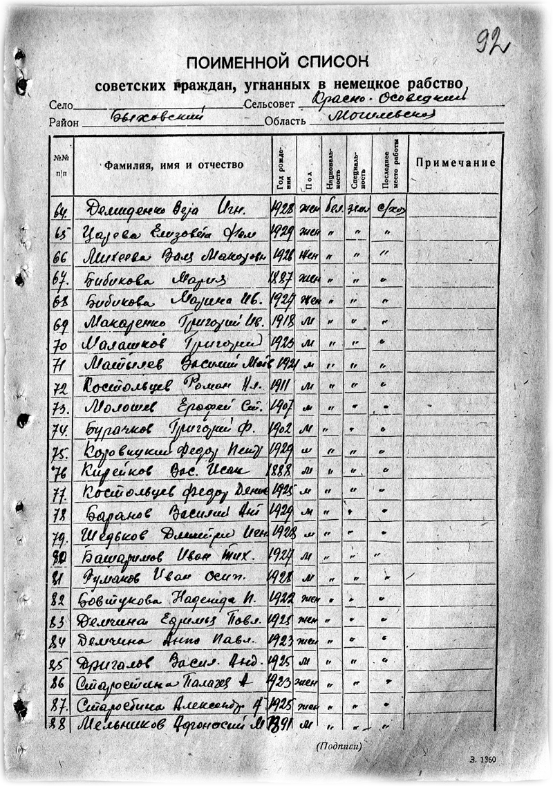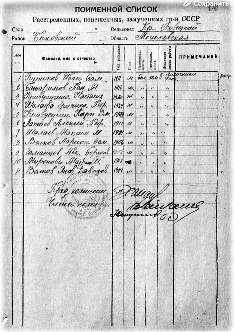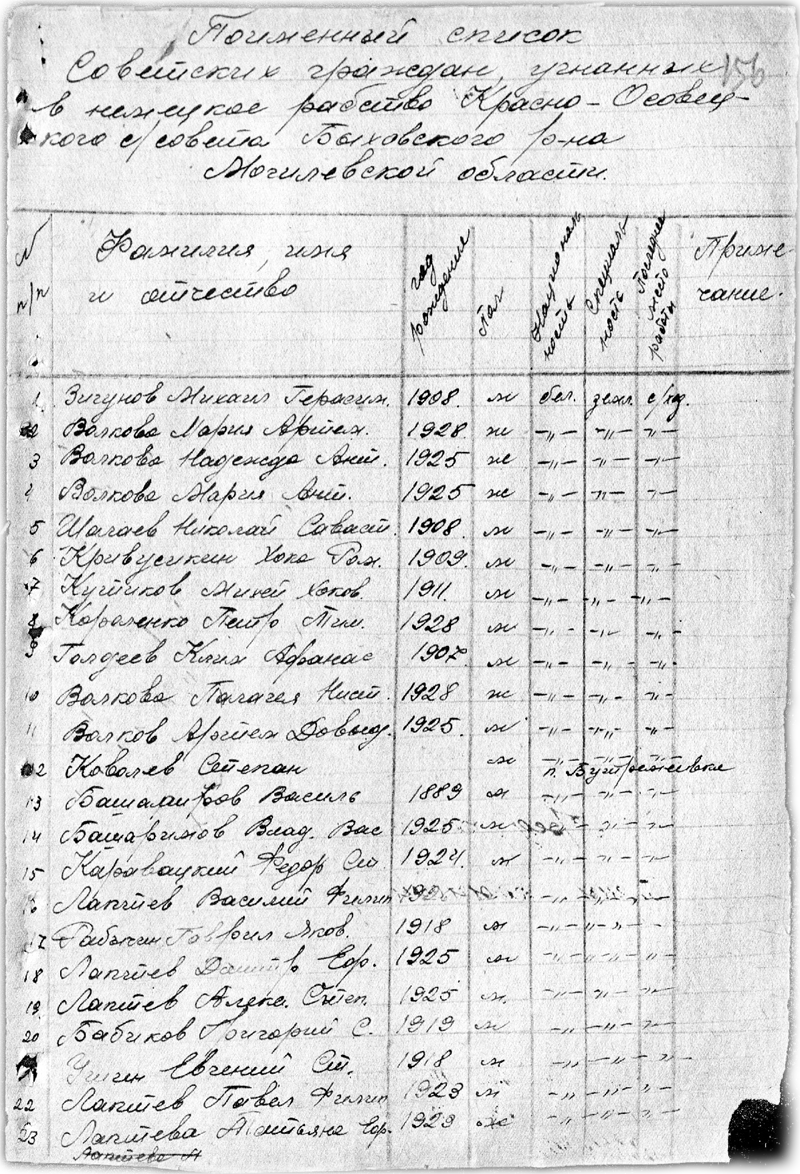 Злодеяния оккупантов в Красноосовецком сельсовете Когда война с нацистской Германией была ещё в самом разгаре, но неминуемая победа антигитлеровской коалиции уже стала очевидной, в Советском Союзе была создана «Чрезвычайная Государственная Комиссия по установлению и расследованию злодеяний немецко-фашистских захватчиков». Постановление об её основании вышло 16 марта 1943 года за подписью И.В. Сталина. В соответствии с этим документом «в местах, освобождённых от оккупантов, создаются республиканские, краевые и областные комиссии». В состав комиссий по расследованию обязательно включались первые секретари ЦК ВКП (б) республик (краёв, областей), председатели Совнаркомов (крайисполкомов, облисполкомов) или его заместители и соответствующий начальник управления НКВД. Кроме них к работе привлекались и другие местные представители. Основными задачами комиссии являлись: «полный учёт преступлений немцев и их пособников; определение ущерба, причинённого немецкими оккупантами советскому государству, его гражданам, колхозам и общественным организациям; установление личностей немецко-фашистских преступников, с целью предания суду и сурового наказания». Для этого Чрезвычайной Государственной Комиссии необходимо было «собирать и проверять документальные данные о злодеяниях гитлеровских преступников и материальном ущербе, понесённом в результате оккупации советских территорий» Могилёвская областная комиссия содействия в работе Чрезвычайной Государственной Комиссии была создана с началом освобождения области от оккупантов, 5 декабря 1943 года. Для организации сбора и систематизации сведений об ущербе создавалась сеть местных комиссий. В колхозах области было создано 2 318 комиссий, для этого задействовано более 6 тысяч человек. Комиссии создавались также в сельских Советах.