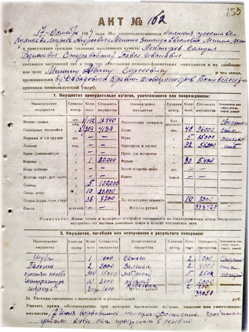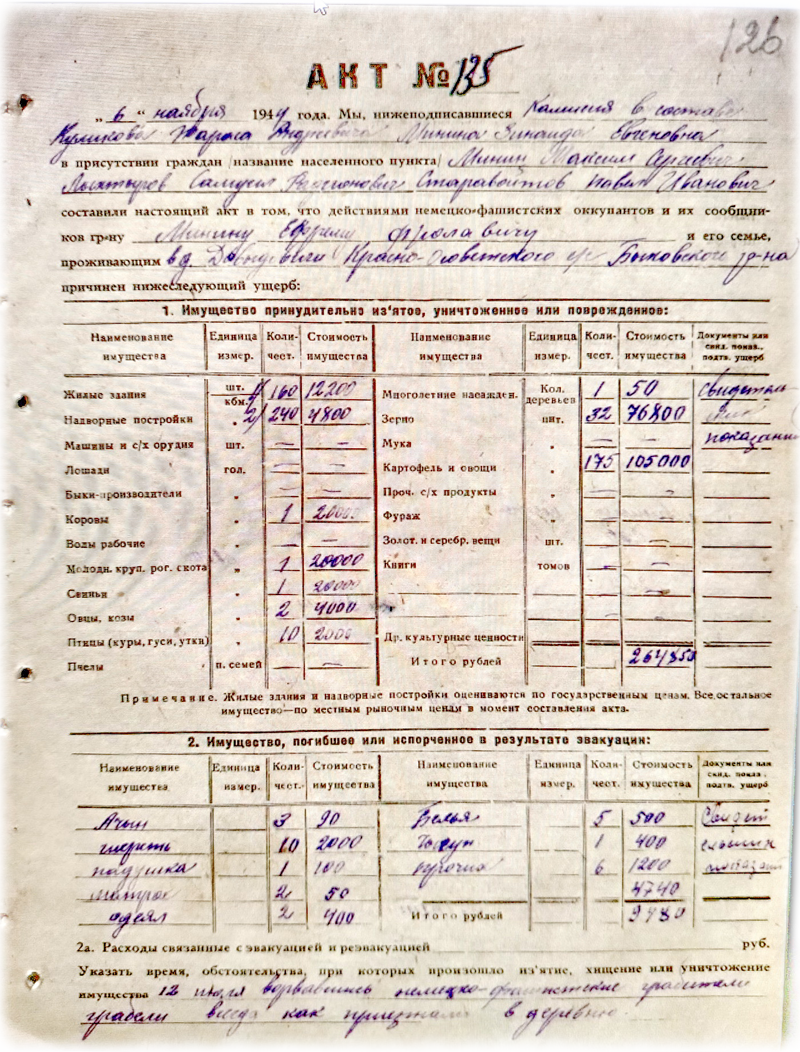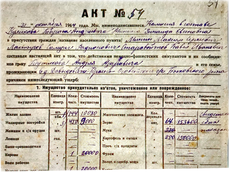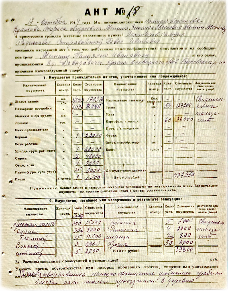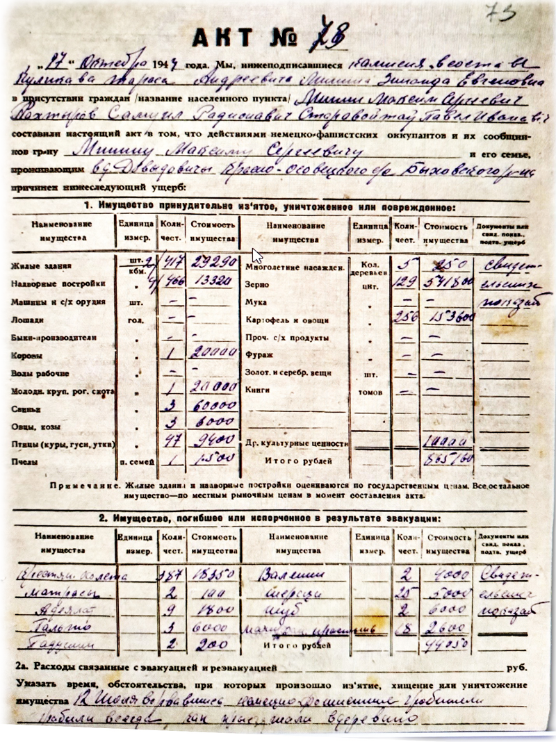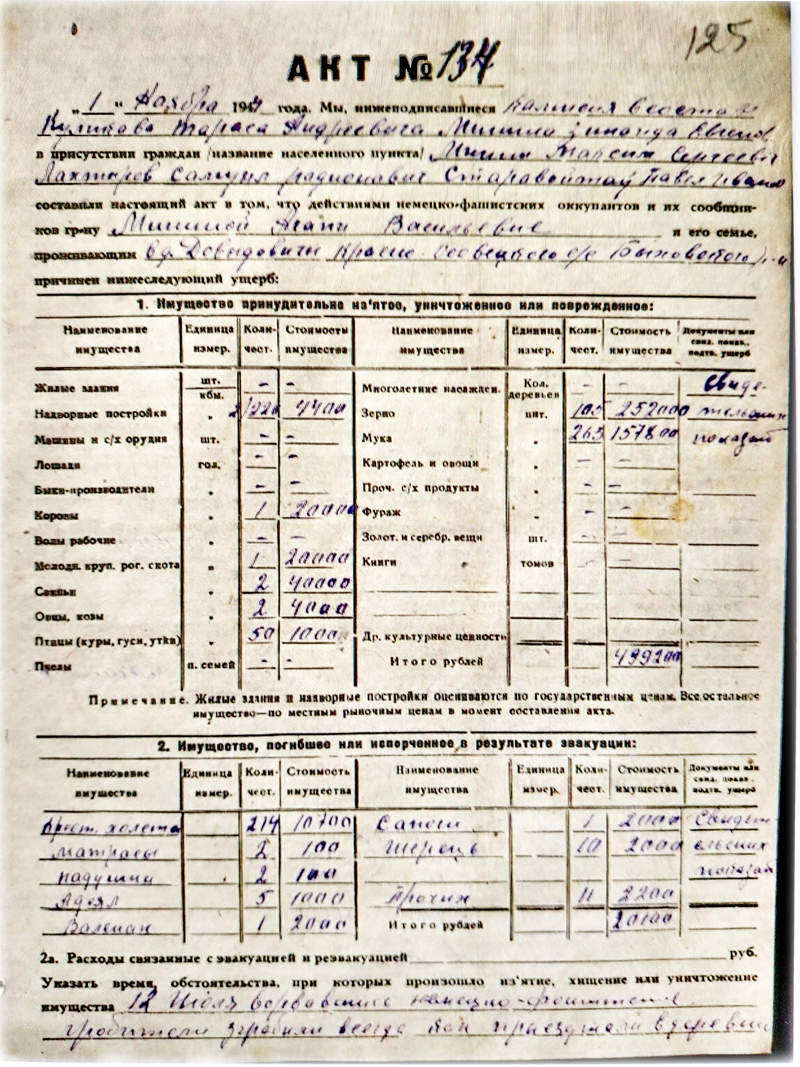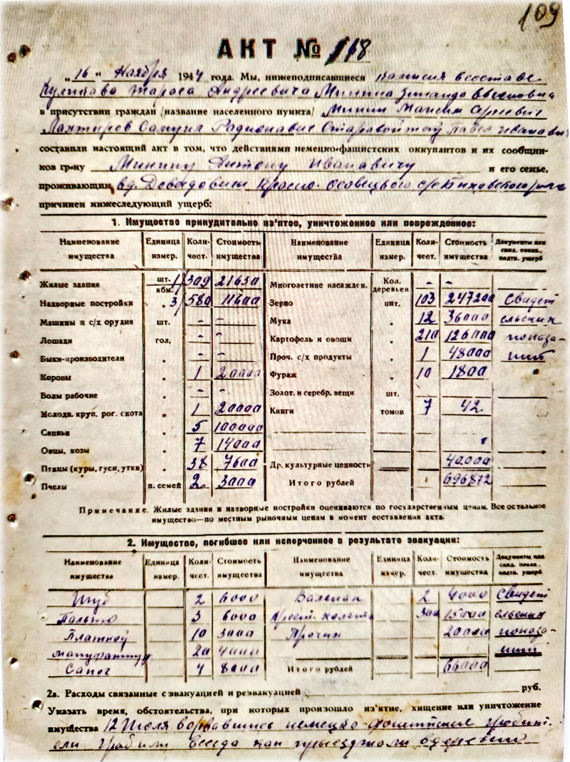 Недавно со мной поделились копиями актов с перечислением ущерба, причинённого немецкими оккупантами жителям деревни Давыдовичи. В основном с фамилией Минин (Минина).