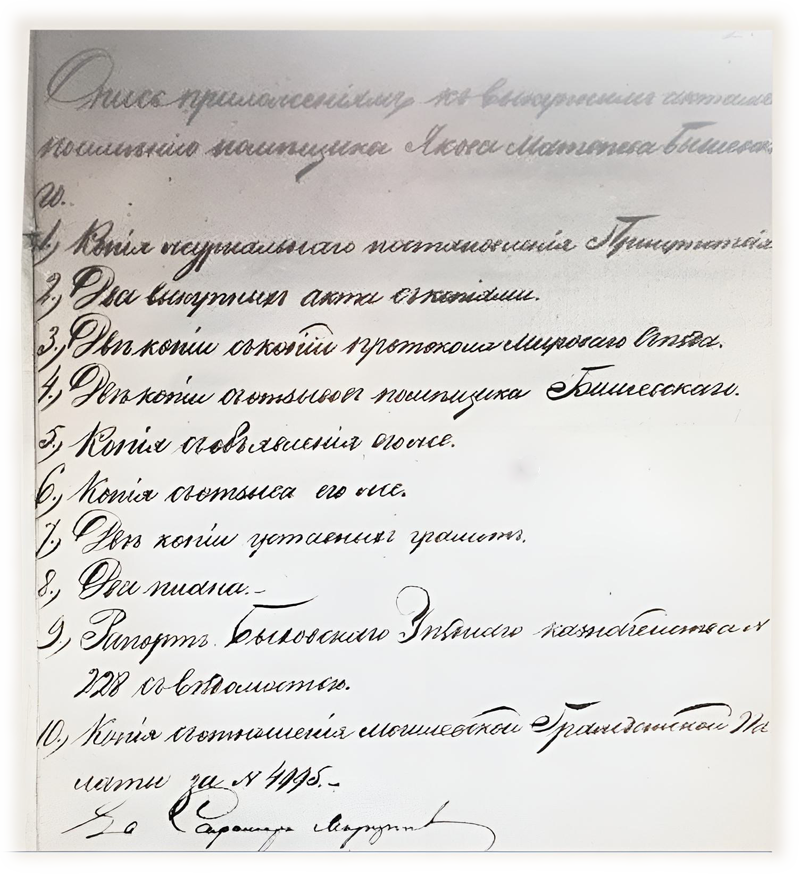IV 1) За предоставленную в пользование крестьян землю причитается оброка, на основании Высочайшего указа 2 ноября 1863 года с каждого душевого надела в год по 6р 40коп. а со всех ста сорока одного наделов девятьсот два рубля сорок копеек серебром. Подлинная уставная грамота составлена 1862 года ноября 20 дня, подписали: помещик Колежский Ассесор Яков Матвеев сын Бишевский, и уполномоченные со стороны крестьян Давыдовицкого сельского общества, равно засвидетельствована Мировым Посредником Оношко.