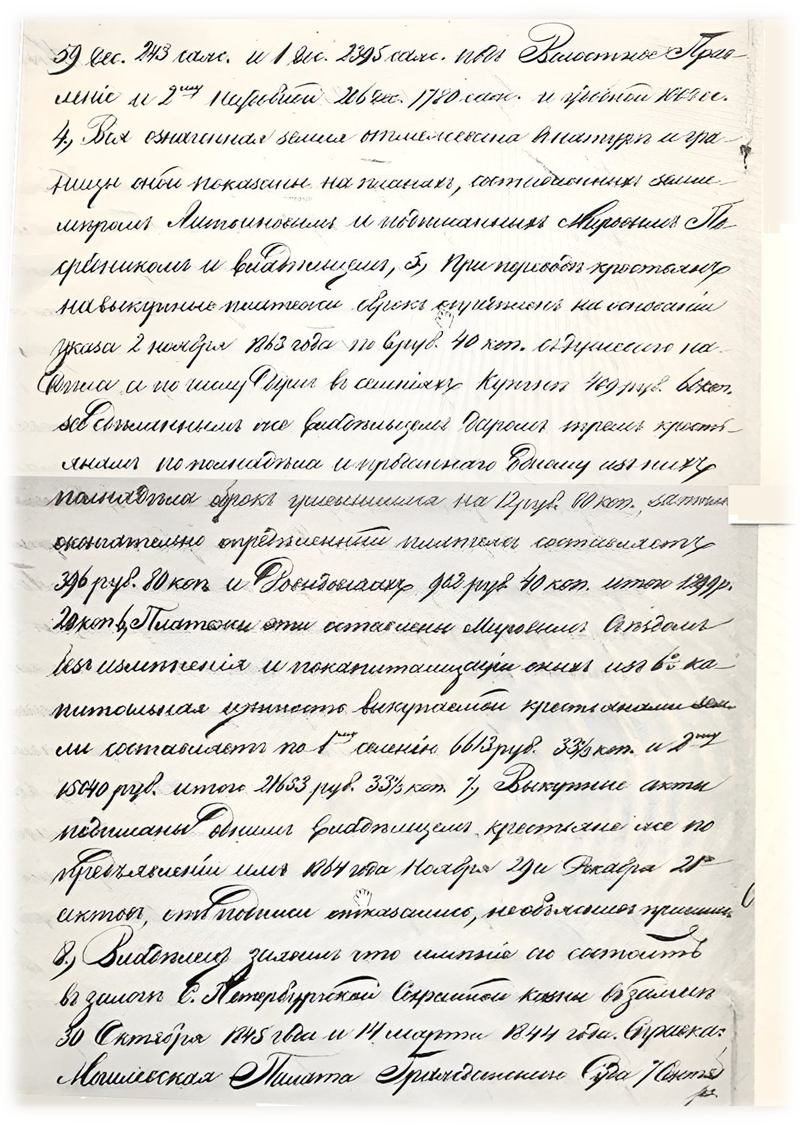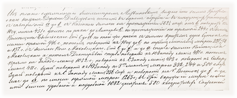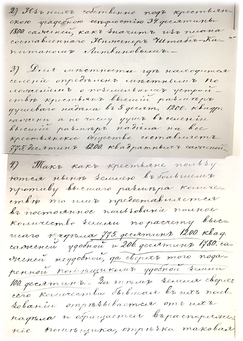 II 1) Всей земли состояло в пользовании крестьян до обнародования положения о крестьянах 805 десятин 897 сажень 2) Из них собственно под крестьянскою усадебною оседлостью 34 десятины 1800 саженей, как значит из плана составленного инженер штабс-капитаном Литвиновым. 3) Для местности где находится селение определен местным положением о поземельном устройстве крестьян высший размер душевого надела в 5 десятин 1200 квадратных сажени а по числу душ в селении высший размер надела на всё крестьянское общество составляет 775 десятин 1200 квадратных саженей. 4) Так как крестьяне пользуются ныне землею в большем противу высшего размера количестве то им предоставляется в постоянное пользование полное количество земли по расчету высшего надела 775 десятин 1200 квадратных саженей удобной и 206 десятин 1780 саженей неудобной, да сверх того подаренной помещиком удобной земли 100 десятин. За тем земля сверх сего количества бывшая в их пользовании отрезывается от их надела и обращается в распоряжение помещика, отрезка таковая произведена из полей отдаленных от селения в том месте где крестьянские земли прилегают к лесному урочищу Ляженке.