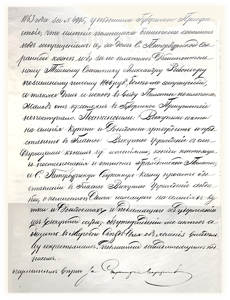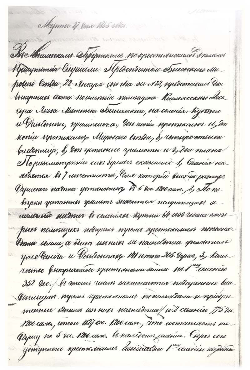 1) Селения находятся в местности, для которой высший размер душевого надела установлен в 5 дес. 1200 саж. 2) По поверке Уставных грамот значится получающих земельный надел в селениях Кутни 64 и Давыдовичах 141 итого 205душ. 3) Количество выкупаемой крестьянами земли по 1-му селению 352 десятины и второму селению 775 десятин 1200 саж., итого 1127 дес. 1200 саж., что составляет на душу по 5 дес. 1200 саж. В каждом селении. Сверх того уступлено крестьянам безвозмездно… и 2-му неудобной 206 дес.1780 саж. и удобной 100 дес. 4) Вся означенная земля отмечена в натуре и границы оной показаны на планах, составленных землемером Литвиновым и подписанных Мировым Посредником и владельцем. 5) При переводе крестьян на выкупные платежи оброк определен на основании Указа 2 ноября 1863 года по 6 руб.40 коп. с душевого надела. 6) Платежи эти оставлены Мировым Отделом без изменения. 7) Выкупные акты подписаны одним владельцем, крестьяне же по предъявлении им 1864 года ноября 29 и декабря 21 акты, от подписи отказались, не объясняя причин. 8) Владелец заявил что имение его состоит в залоге С.Петербургской Сохранной казны в займе 30 октября 1845 года и 14 марта 1844 года за неплатеж Действительному Тайному Советнику Александру Рибопьеру позаемному письму 1000 руб, больше же запрещений, а также … в виду Палаты не имеется. Жалоб от крестьян в Губернское Присутствие не поступало. Постановили: Выкупные акты на селения Кутни и Давыдовичи утвердить