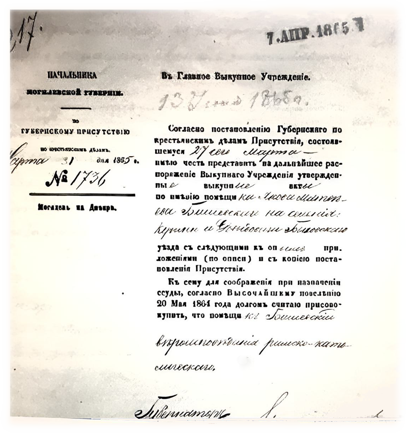 Дело о выкупе земельных наделов крестьянами села Кутня и деревни Давыдовичи Быховского уезда Могилевской губернии РГИА. 577 / 19 / 8 Дело о выкупе земельных наделов временнообязанными крестьянами Я.М. Бишевского селения Кунина Быховского уезда Могилевской губернии