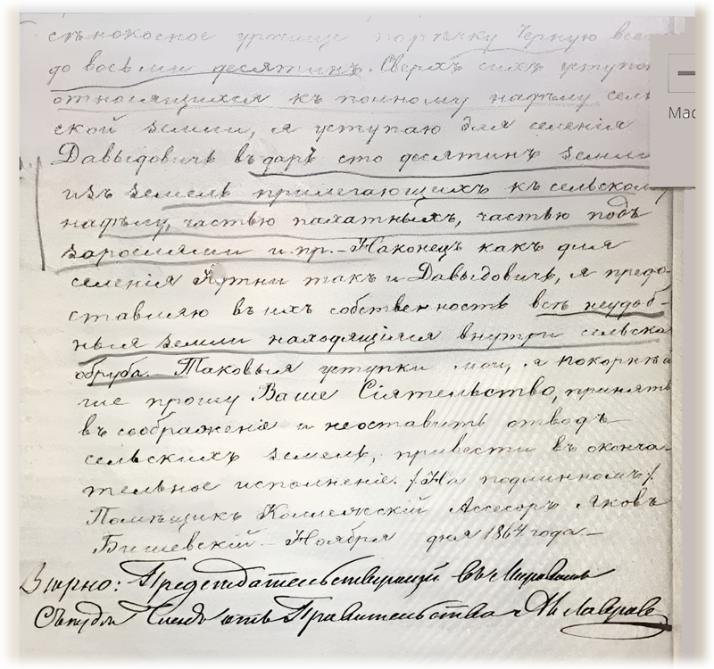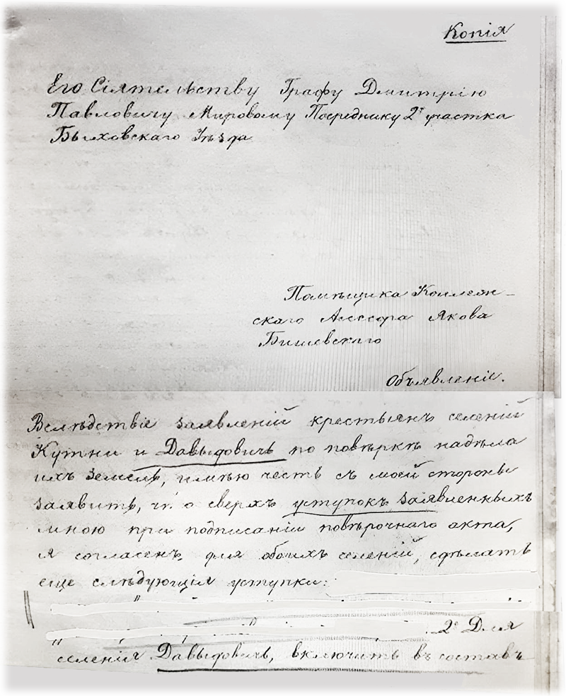 1864 года ноября 29 дня акт сей был прочитан уполномоченным крестьянам д. Давыдович, которые от подписей отказались, не объявив точной тому причины, хотя на продажи данного надела и причисленного платежа неудовольствия не проявили. С подлинным верно Мировой посредник Граф Толстой