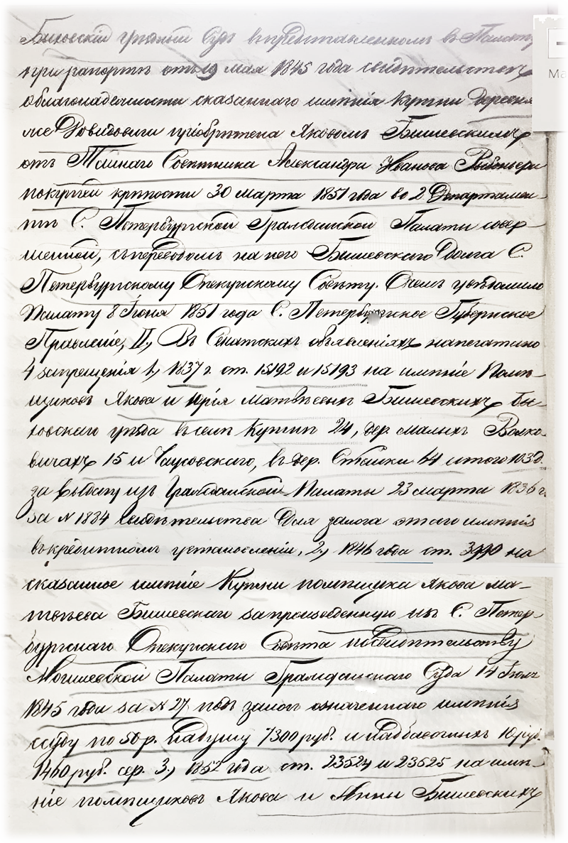 1) Село Кутни досталось помещику Якову Бишевскому по раздельным актам совершенным в Быховском уездном суде 18 сентября 1836 года и 29 сентября 1838 года между им и братьями его Климом, Данилою, Ефимом и Захарием Бишевскими. Деревня же Давыдовичи приобретена Яковом Бишевским от Тайного Советника Александра Иванова Рибопьера по купчей крепости 30 марта 1851 года во 2 департаменте С.Петербургской Гражданской Палаты совершенной, с переводом на него Бишевского долга С.Петербургскому Опекунскому Совету. Опека уведомила Палату 8 июня 1851 года С.Петербургское Губернское Правление. В Сенатских объявлениях напечатано 4 запрещения в 1837 г от№1592 и №1593 на имения помещиков Якова и Юрия Матвеевых Бишевских Быховского уезда в селе Кутни 24, дер. Малых Волковичах 15 Чаусовского, в дер. Стайки 64, итого 103 души за выдачу Из Гражданской Палаты 23 марта 1836 года за №1884 свидетельства для залога от его имения в кредитном установлении, 2) 1846 года от №3990 на сказанное имение Кутни помещика Якова Матвеева Бишевского за произведенную из С.Петербургского Опекунского Совета по свидетельству Могилевской Палаты Гражданского Суда 14 июля 1845 года за №27 под залог означенного имения ссуду по 50 р. На душу 7300 руб. и надбавочных 10 руб. 1460 руб. серебром. 3) 1852 года от 23524 и 23525 на имение помещиков Якова и Анны Бишевских В дер. Давыдовичах 115 в Сутоках 126 и Волковичах 37 душ за произведенную из С.Петербургского Опекунского Совета Тайному Советнику Александру Рибопьеру под залог от сего имения по свидетельству Могилевской Палаты Гражданского Суда 27 мая 1840 года за №2666 ссуды 16900 руб. серебром. После же перехода к Бишевским этого имения запрещение считается от имени их Бишевских по числу купленных 160 душ за долг Опекунскому Совету.