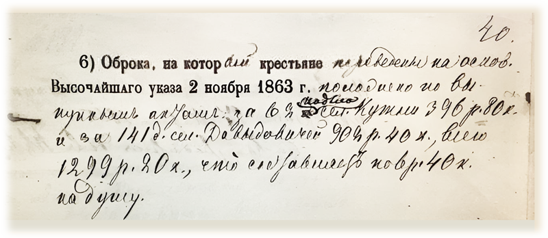 Выкупная ссуда в размере 15040 руб. предоставлялась банком сроком с 1 января 1864 года на 49 лет. До революции, получается, всё и выплатили. В действительности, итог получился поменьше. Правительство, напуганное размахом крестьянских выступлений в 1905 году (событий, известных ныне как первая русская революция), уже на следующий год отменило, наконец (начиная с 1907-го), выкупные платежи. Тем более, что по ним к тому времени накопилась изрядная недоимка.