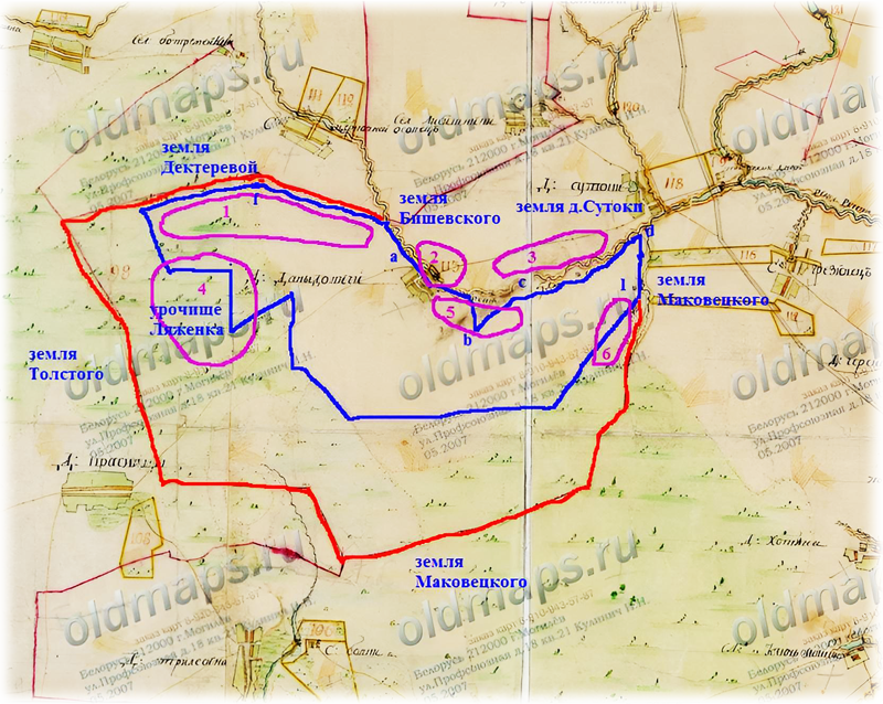 Понятно, что за более чем 80 лет много чего изменилось на этой, интересной нам, территории. Земли Боровского и Толстого на давыдовичских границах в описании не фигурируют, но граф Толстой присутствует в тех документах в должности Мирового Посредника. Могу предположить, что крестьянский обруб нигде не имел прямого соприкосновения с землями графа Толстого, вот и нет о нем упоминания в Выкупном акте. Земли Бишевского имели общую межу с землями графа, а вот крестьянские наделы не граничили. Попробовал нанести план землемера Литвинова 1865 года на план 1783 года, воспользовавшись его описанием в Выкупном акте 1865 года и соразмерив те расстояния в саженях с масштабом используемого плана. Если строго следовать описанию, то сделать это не получается. Толи в направлениях или размерах описания вкралась ошибка, толи план 1783 года не совсем точно начерчен был. Пришлось в некоторых местах отступить от описания и пририсовать 1-2 линии исходя из логических соображений.