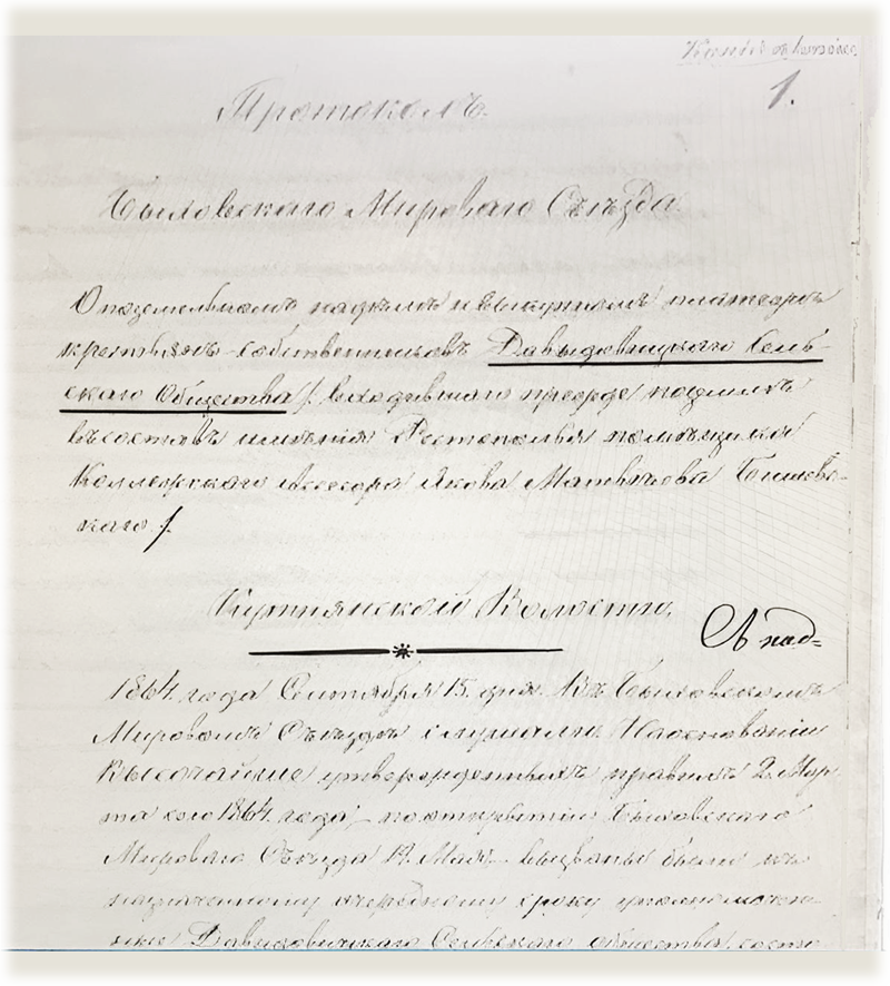 Размер предоставляемых крестьянам участков, как и перечень повинностей, которыми «временнообязанные» обременялись за пользование землей, записывали в упоминаемую в деле «уставную грамоту». Это был введенный реформой договор между помещиком и крестьянами, подлежавший контролю особых представителей властей – мировых посредников (чья должность, занимаемая исключительно выходцами из дворян, появилась тоже благодаря крестьянской реформе). Составлять уставную грамоту надлежало на каждое имение, причем такой договор заключался со всеми получателями надела сразу, волей-неволей объединенным в «сельское общество». Соответственно, «Давыдовичское» фигурирует в деле от лица крестьян, выстраивая свои дальнейшие отношения с землевладельцем, помещиком Яковом Матвеевичем Бышевским. Уставная грамота о наделении землею крестьян деревни Давыдовичи составлена в ноябре месяце 1862 года помещиком Колежским Ассесором Яковом Матвеевым Бишевским.