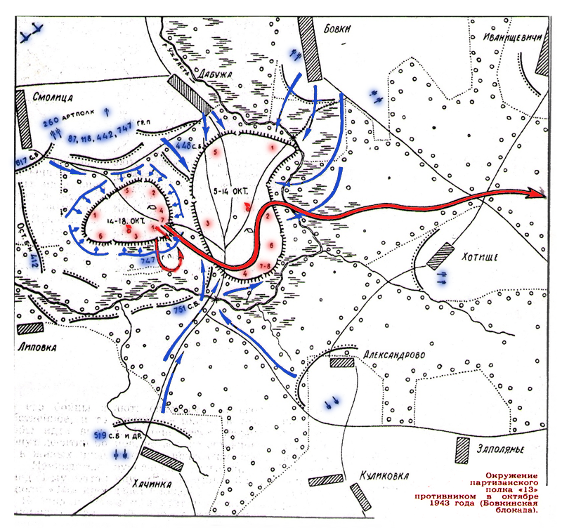 Наши партизаны. Бовкинская блокада. Чем дальше в лес, тем толще партизаны, - гласит известная шутка. А вообще, смысл пословицы это не изменило - чем глубже вникаешь в проблему, тем больше неожиданностей. Начнем хотя бы с того, что все партизаны-земляки свидетельствуют, что единственный официальный партизан с Давыдович Кузьмин Григорий Тимофеевич погиб 22 октября 1943 года «у час» прорыва из окружения в Ветренском болоте. В книге «В атаку поднимался первым» командира 15-го партизанского полка Демидова Александра Сергеевича находим, что прорывались действительно через болото между деревнями Радьково и Смолица рано утром, а вот дата не указывается. Утром 25 октября полк ещё ведет бои в блокаде и на прорыв идет то ли 26, то ли 27 октября. Попробуем поискать дату прорыва в других источниках. Бовкинская блокада (из книги Григория Алексеевича Ворожищева «По радиограмме в Быховский район ...»): 10 октября каратели все же вошли в лес. Командир полка № 15 Демидов в разговоре с Гришиным настаивал, что пока есть возможность, а она была, идти на переправу через Днепр. Хорошо зная местность и имея запрятанные плавсредства, Демидов считал, что сейчас сравнительно легко можно прорвать кольцо блокады и под прикрытием длинной октябрьской ночи выйти к реке и переправиться на её правый берег. Гришин сообразуясь с обстановкой, тем, что полк имеет большой госпиталь, длинный обоз с ранеными, а предлагаемый Демидовым маршрут до Днепра сплошным болотом - дело опасное и, главное, надеясь на выручку Красной Армии, это предложение отклонил. Демидов с остатками полка (примерно батальон) двинулся на запад. 14 октября, в штабной землянке собрались: Гришин, комиссар полка Стрелков, начальник штаба полка Узлов, начальник разведки, командиры батальонов, начштаба отряда № 48 Ясюченя. Обсудив ситуацию, решили пойти на прорыв блокады и двинуться на запад, через Днепр. В пользу этого решения говорило и донесение разведки о том, что в некоторых местах на подходах к Днепру и на самой реке немецкие засады сняты. Ночь на 15 октября спустилась черная, влажно прохладная, над лесом, уродливо остриженным снарядами и бомбами, волнами пробегал ветер. Люди готовились к движению. Вдруг разведка принесла, казалось бы, радостную весть: западная часть леса, вход в Смолицкое болото свободны. Каратели поспешно снялись и бесшумно куда-то исчезли. Для Гришина это была уже загадка. Ведь весь предыдущий день батальоны Звездаева и Матяша отбивали там беспрерывные атаки гренадеров, поддерживаемые танками. И вдруг перед партизанами - настежь «распахнутые» ворота?» - Не ловушку ли приготовили для нас? - высказал своё подозрение Гришин, отличавшийся обостренным чутьем на разнообразные каверзы фашистов. Однако и выбирать командиру полка было не из чего. В этом лесу, обложенным со всех сторон отборными полками гренадеров, оставаться было нельзя. Маневренность отпадает. Значит, нужно сменить место дислокации. Пока гитлеровцы спохватятся, ведут разведку, перегруппировку сил, а партизаны решили пойти через Днепр, как это сделал Демидов. Смотришь, партизанское командование «клюнет» на эту приманку, сами выйдут туда, где капканчик захлопнется. Пройдя примерно трехкилометровый путь от прежнего лагеря, Гришин остановил полк в густом хвойном лесу. Батальоны полка «Тринадцать» сразу же рассредоточились замкнуты